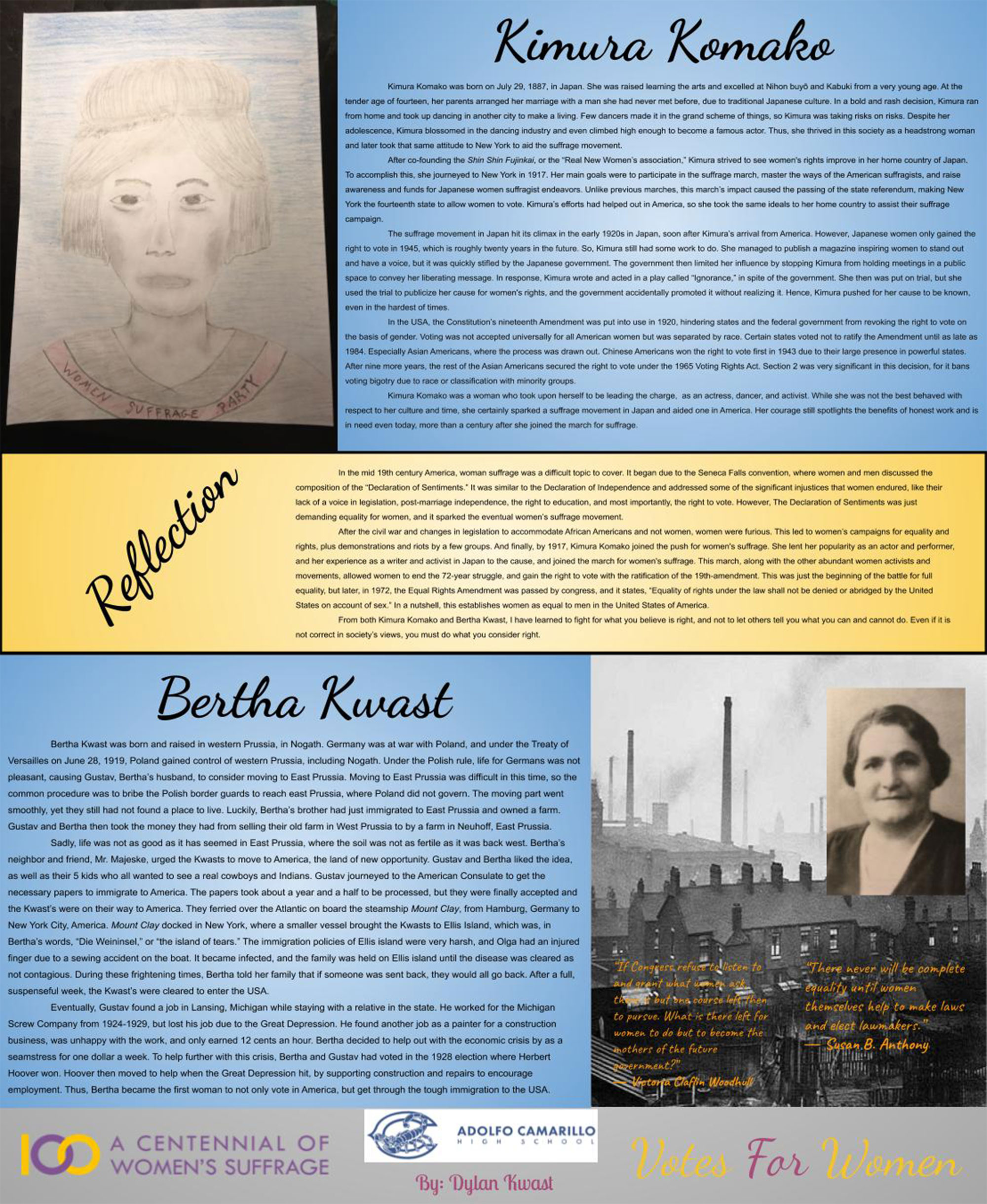 After the Civil War and changes in legislation to accommodate African Americans and not women, women were furious. This led to women’s campaigns for equality and rights, plus demonstrations and riots by a few groups. And finally, by 1917, Kimura Komako joined the push for women's suffrage. She lent her popularity as an actor and performer, and her experience as a writer and activist in Japan to the cause, and joined the march for women's suffrage. This march, along with the other abundant women activists and movements, allowed women to end the 72-year struggle, and gain the right to vote with the ratification of the 19th-amendment in 1920.