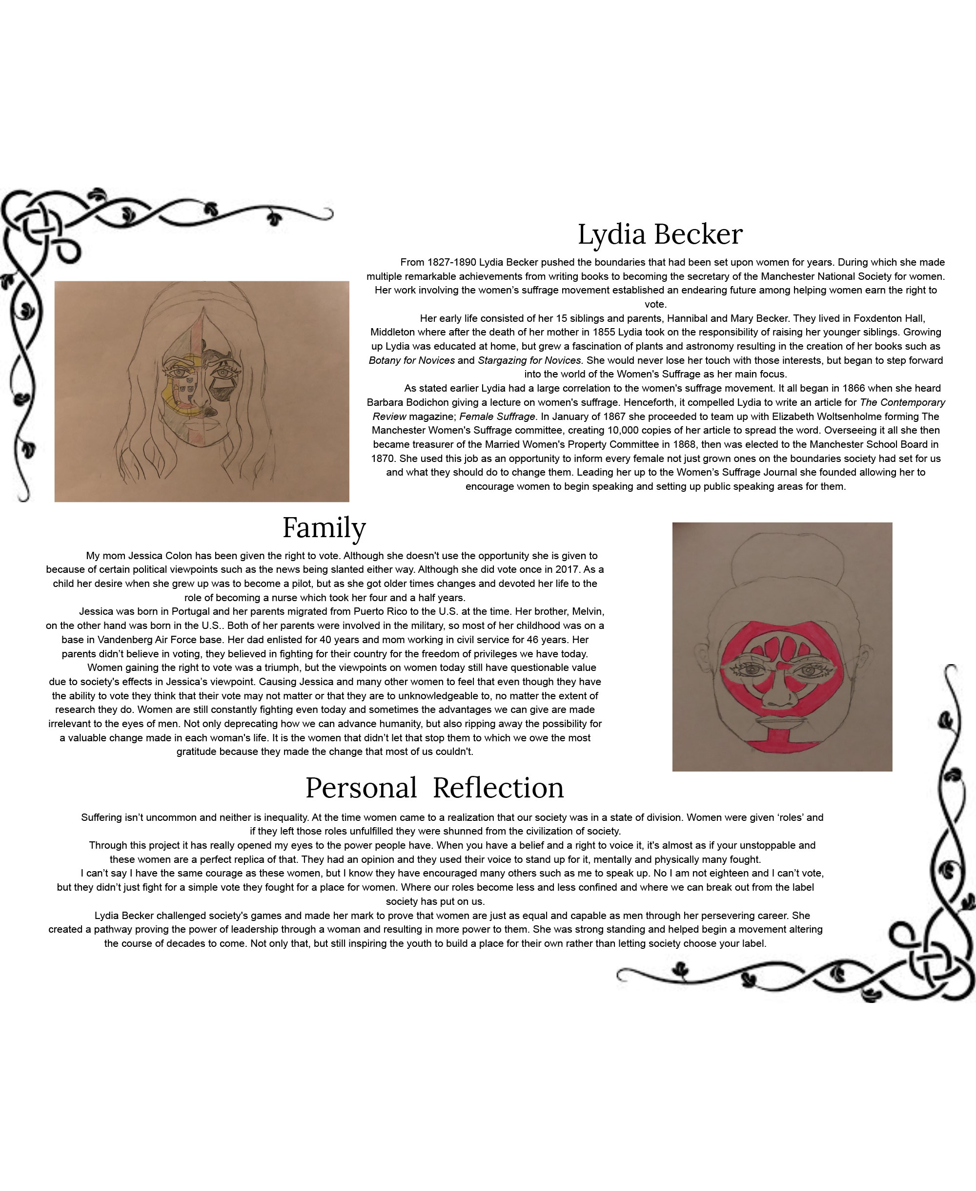 Women gaining the right to vote was a triumph, but Jessica believes that the viewpoints on women today still have questionable values due to society's effects. This causes Jessica and many other women to feel that even though they have the ability to vote they think that their vote may not matter or that they are too unknowledgeable, no matter the extent of research they do. Women are still constantly fighting even today and sometimes the advantages we can give are made irrelevant to the eyes of men. This not only deprecates how we can advance humanity, but also rips away the possibility for a valuable change made in each woman's life. It is the women that didn’t let that stop them to which we owe the most gratitude because they made the change that most of us couldn't.