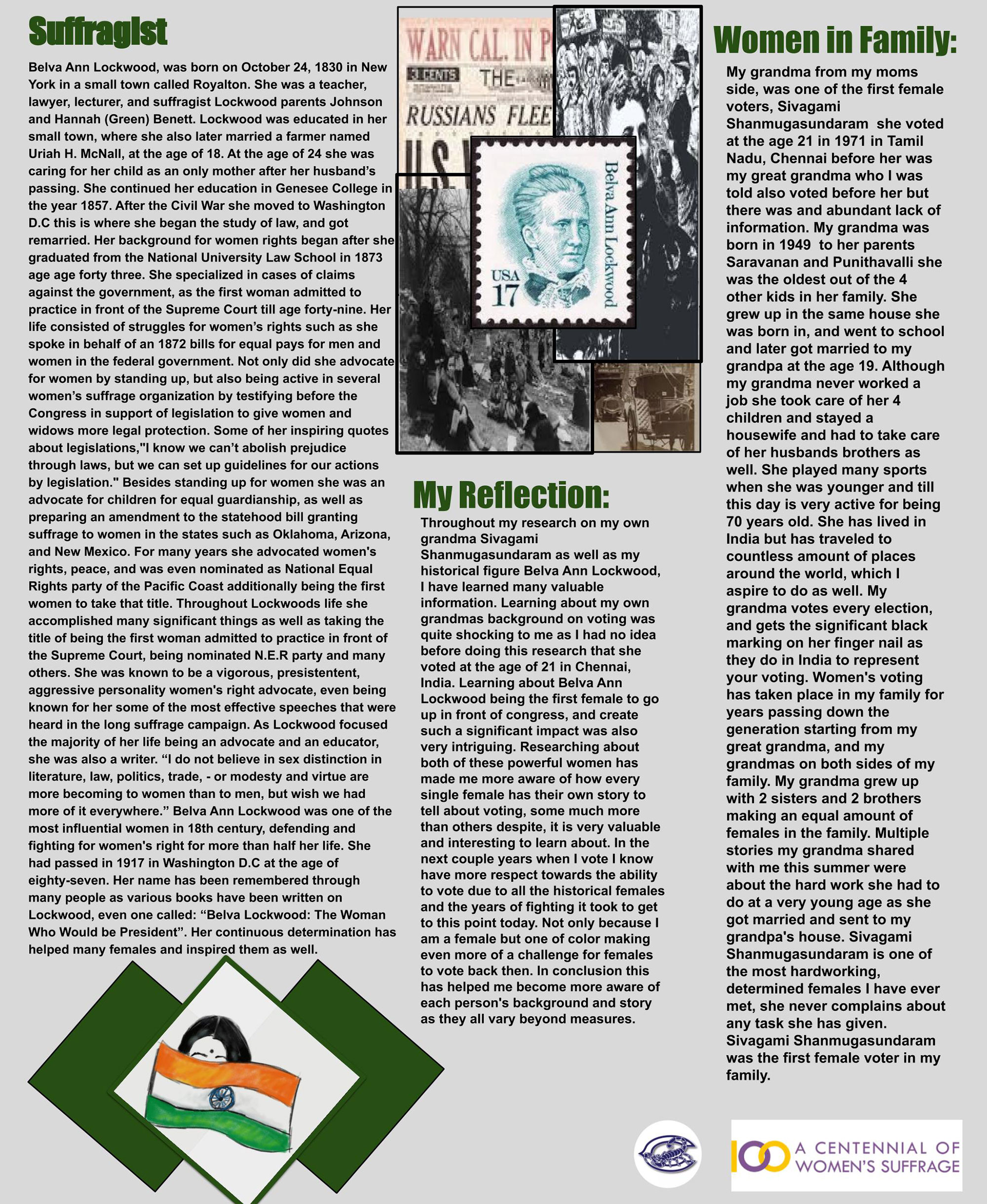 Throughout my research on my own grandma Sivagami Shanmugasundaram as well as my historical figure Belva Ann Lockwood, I have learned a lot of valuable information. Learning about my own grandma’s background on voting was quite shocking to me as I had no idea before doing this research that she voted at the age of 21 in Chennai, India.
