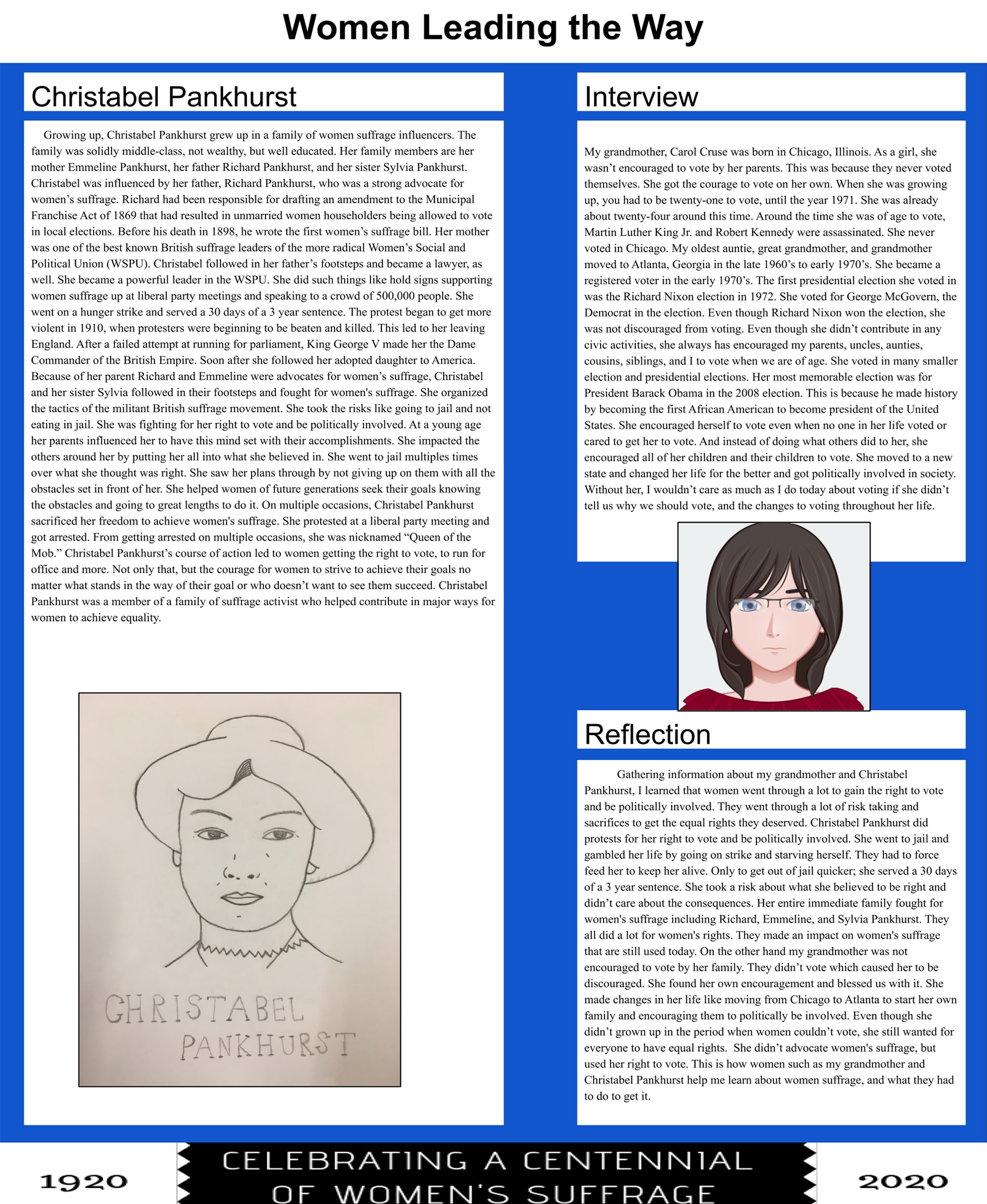 Gathering information about my grandmother and Christabel Pankhurst, I learned that women went through a lot to gain the right to vote and be politically involved. They went through a lot of risk taking and sacrifices to get the equal rights they deserved. Christabel Pankhurst did protests for her right to vote and be politically involved. She went to jail and gambled her life by going on strike and starving herself. They had to force feed her to keep her alive. Only to get out of jail quicker; she served 30 days of a 3 year sentence. She took a risk about what she believed to be right and didn’t care about the consequences. Her entire immediate family fought for women's suffrage including Richard, Emmeline, and Sylvia Pankhurst. They all did a lot for women's rights. They made an impact on women's suffrage that is still felt today.