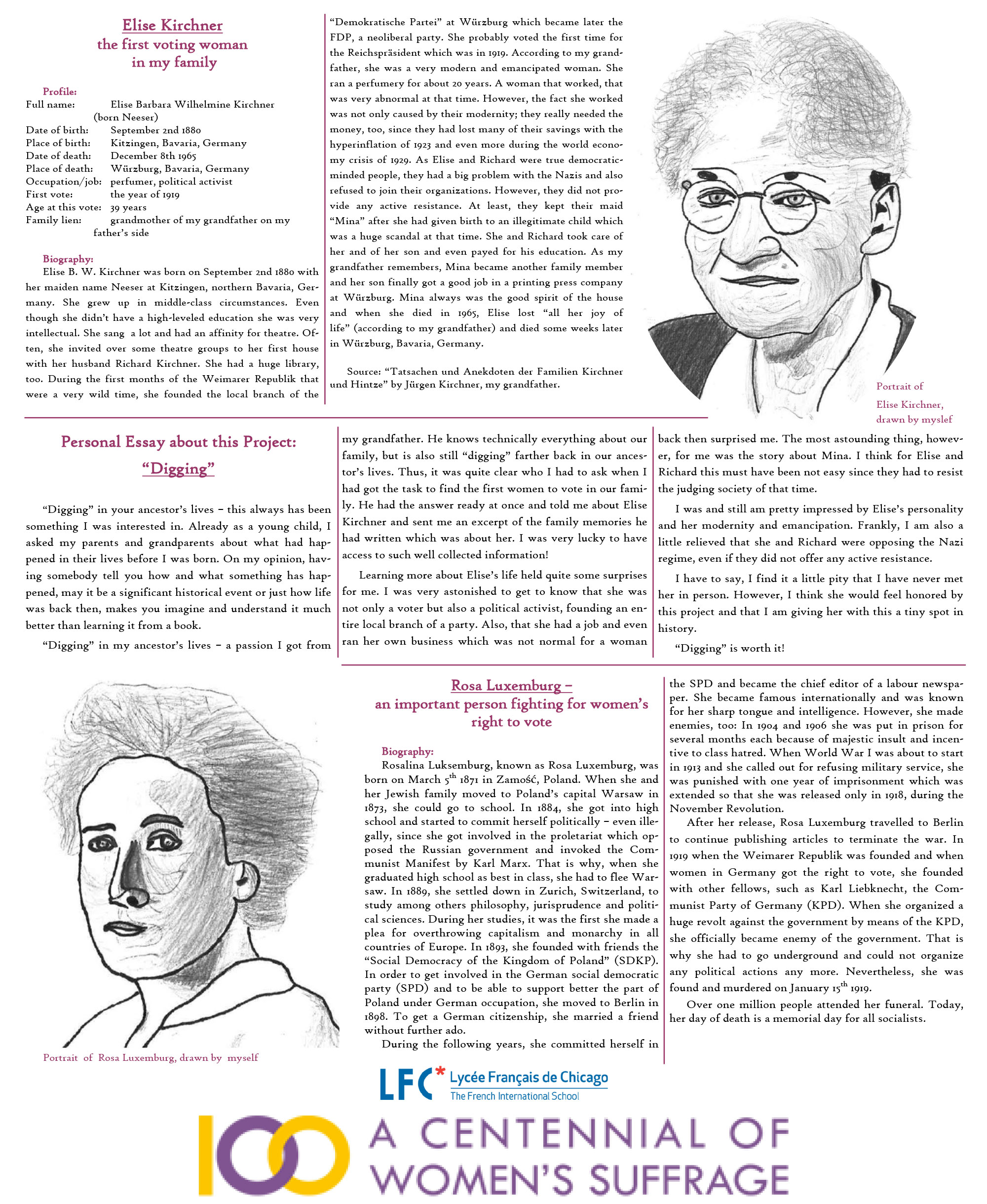 “Digging” into my ancestor’s lives is a passion I got from my grandfather. He knows technically everything about our family, but is also still “digging” farther back into our ancestors’ lives. Thus, it was quite clear who I had to ask when I took on the task of finding the first woman to vote in our family. He had the answer ready at once and told me about Elise Kirchner and sent me an excerpt of the family memoirs he had written about her. I was very lucky to have access to such well collected information!
