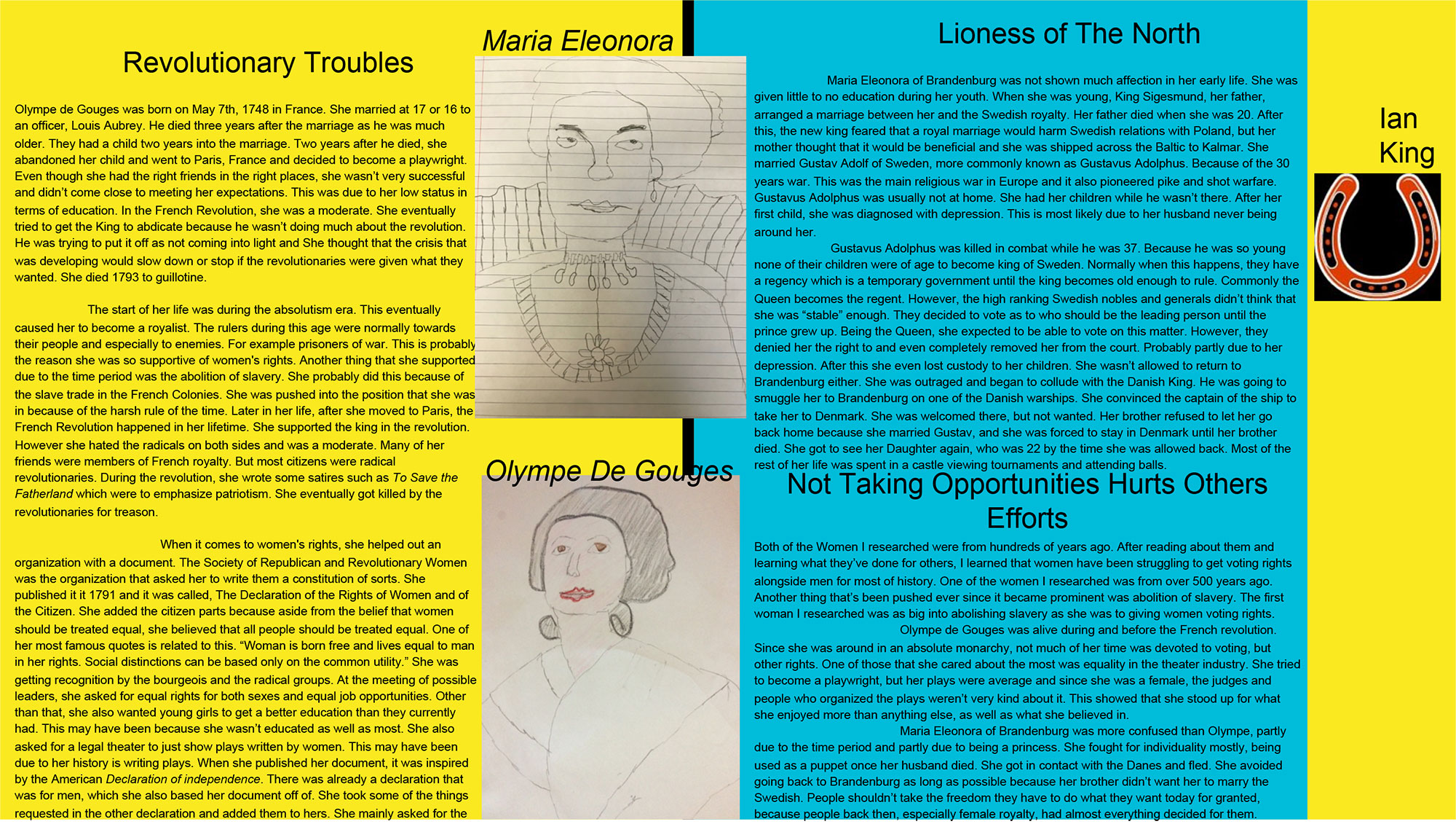 Maria Eleonora of Brandenburg was more confused than Olympe, partly due to the time period and partly due to being a princess. She fought for individuality mostly, being used as a puppet once her husband died. She got in contact with the Danes and fled. She avoided going back to Brandenburg as long as possible because her brother didn’t want her to marry the Swedish. People shouldn’t take the freedom they have to do what they want today for granted, because people back then, especially female royalty, had almost everything decided for them.