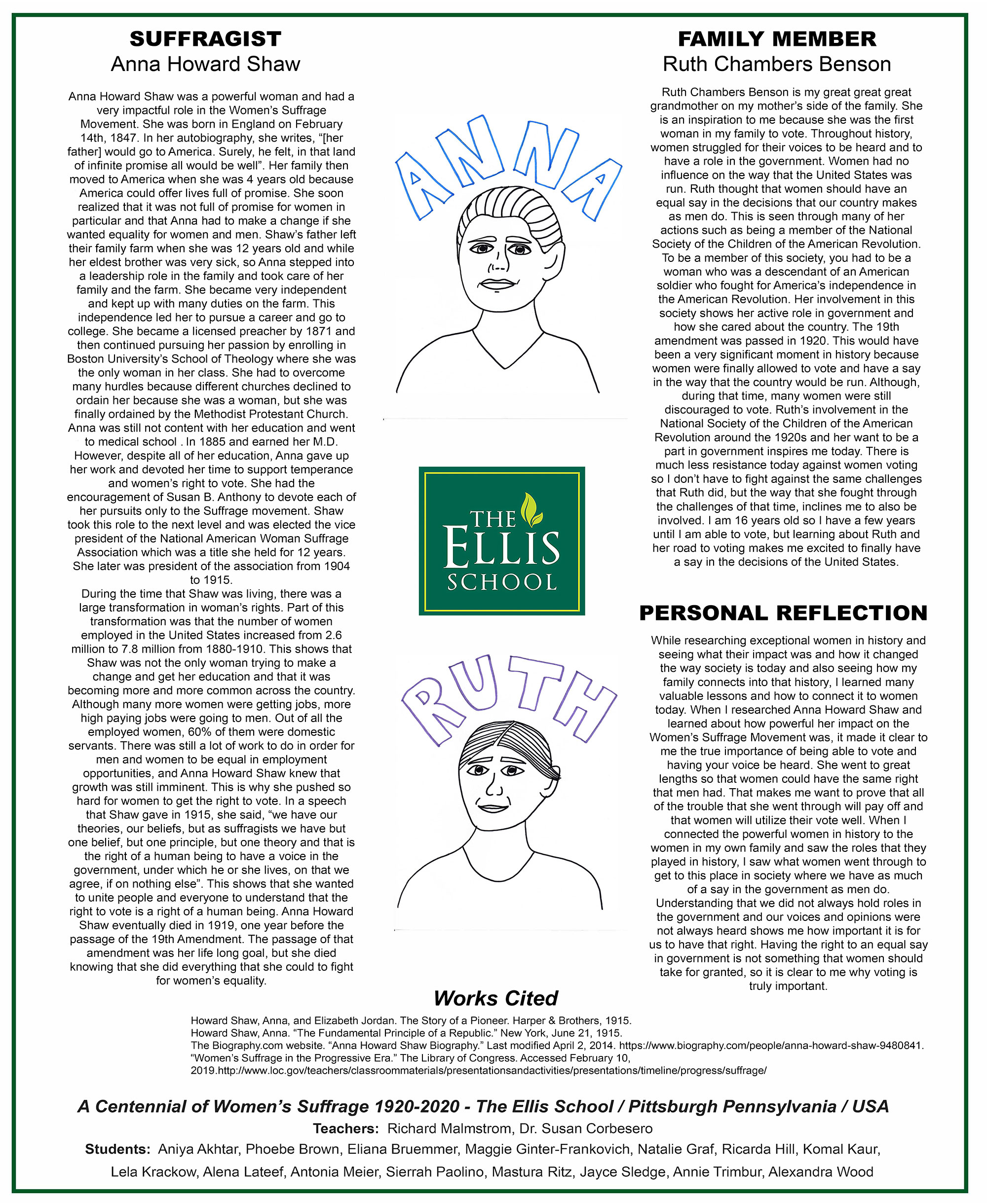 While researching exceptional women in history and seeing what their impact was and how it changed the way society is today and also seeing how my family connects into that history, I learned many valuable lessons and how to connect it to women today. When I researched Anna Howard Shaw and learned about how powerful her impact on the Women’s Suffrage Movement was, it made it clear to me the true importance of being able to vote and having your voice be heard. She went to great lengths so that women could have the same right that men had. That makes me want to prove that all of the trouble that she went through will pay off and that women will utilize their vote well. When I connected the powerful women in history to the women in my own family and saw the roles that they played in history, I saw what women went through to get to this place in society where we have as much of a say in the government as men do. Understanding that we did not always hold roles in the government and our voices and opinions were not always heard shows me how important it is for us to have that right. Having the right to an equal say in government is not something that women should take for granted, so it is clear to me why voting is truly important.
