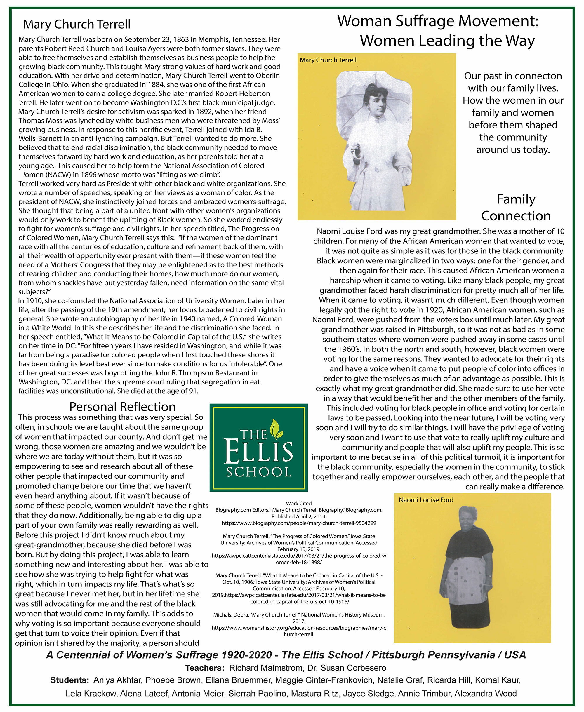 This process was something that was very special. So often, in schools we are taught about the same group of women that impacted our country. And don’t get me wrong, those women are amazing and we wouldn’t be where we are today without them, but it was so empowering to see and research about all of these other people that impacted our community and promoted change before our time that we haven’t even heard anything about. If it wasn’t because of some of these people, women wouldn’t have the rights that they do now. Additionally, being able to dig up a part of your own family was really rewarding as well.