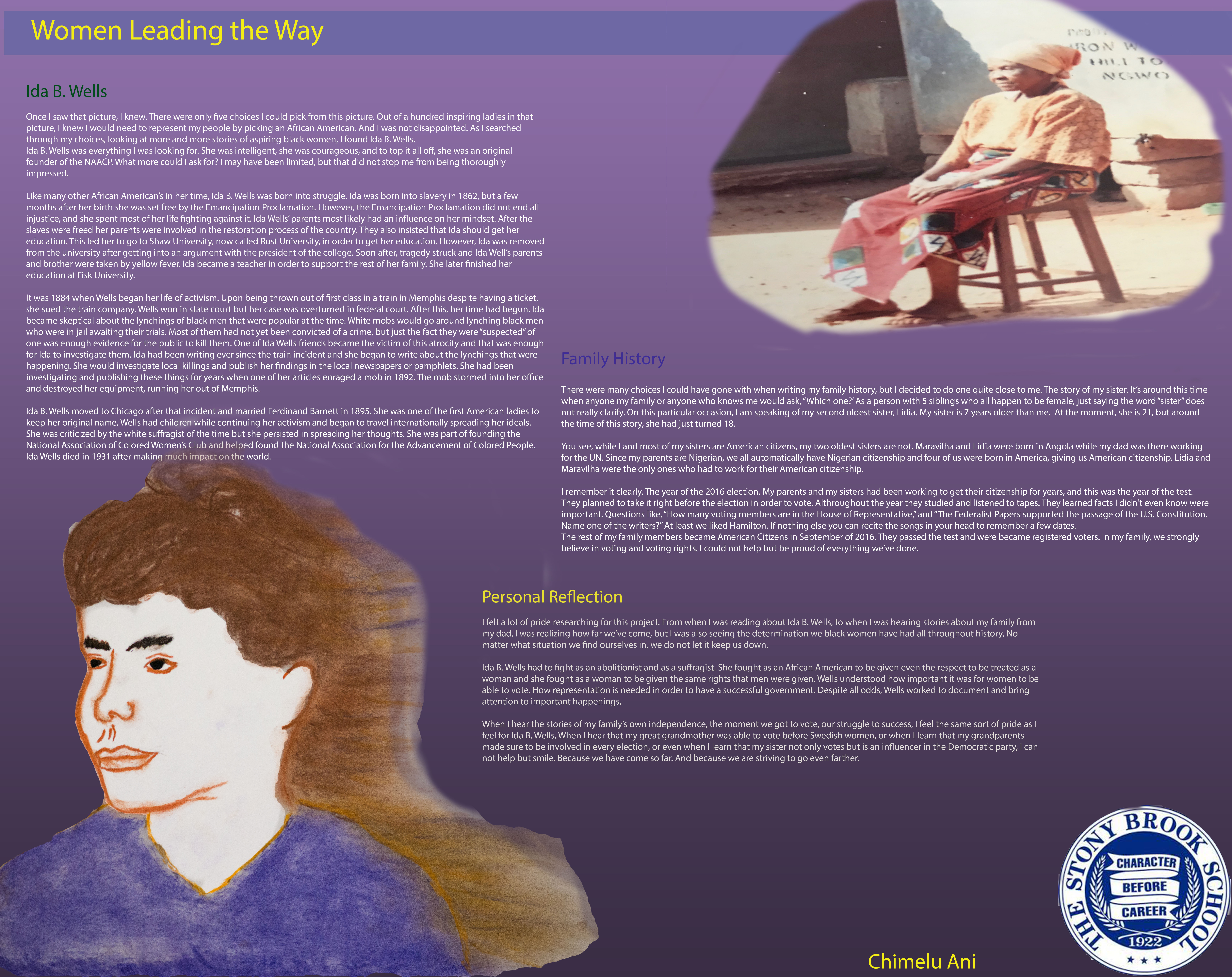 Once I saw that picture, I knew. There were only five choices I could pick from out of a hundred inspiring ladies in that picture; I knew I would need to represent my people by picking an African American, and I was not disappointed. As I searched through my choices, looking at more and more stories of inspiring black women, I found Ida B. Wells. Ida B. Wells was everything I was looking for. She was intelligent, she was courageous, and to top it all off, she was an original founder of the NAACP. What more could I ask for? I may have been limited, but that did not stop me from being thoroughly impressed.