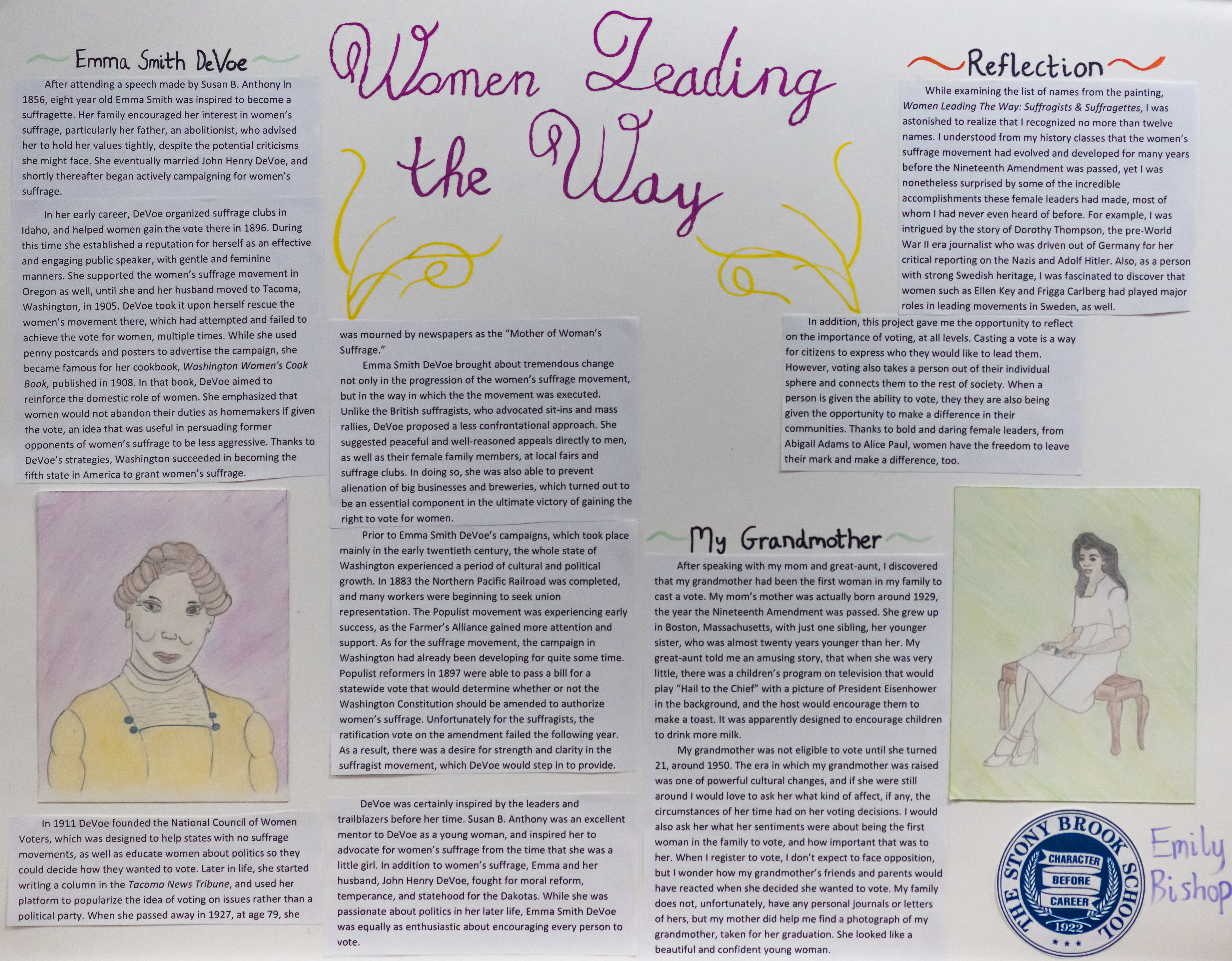 In addition, this project gave me the opportunity to reflect on the importance of voting, at all levels. Casting a vote is a way for citizens to express who they would like to lead them. However, voting also takes a person out of their individual sphere and connects them to the rest of society. When a person is given the ability to vote, they are also being given the opportunity to make a difference in their communities. Thanks to bold and daring female leaders, from Abigail Adams to Alice Paul, women have the freedom to leave their mark and make a difference, too.