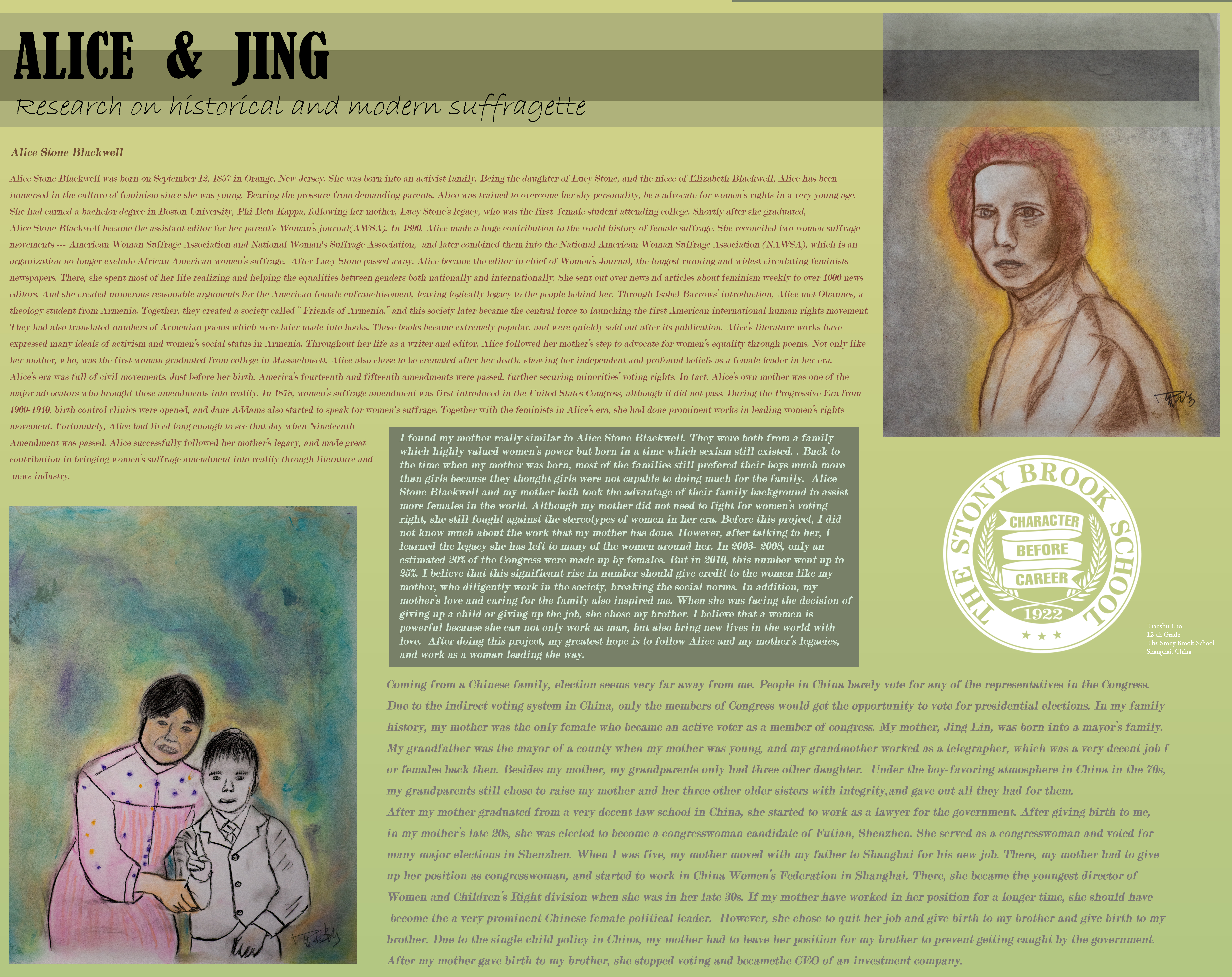 I found my mother really similar to Alice Stone Blackwell. They were both from families which highly valued women’s power, but were born during a time in which sexism still existed. Back to the time when my mother was born, most of the families still preferred boys much more than girls because they thought girls were not capable of doing much for the family. Alice Stone Blackwell and my mother both took advantage of their family backgrounds to assist more females in the world. Although my mother did not need to fight for women’s voting rights, she still fought against the stereotypes of women in her era. Before this project, I did not know much about the work that my mother has done. However, after talking to her, I learned the legacy she has left to many of the women around her. From 2003-2008, only an estimated 20% of the Congress were made up by females. But in 2010, this number went up to 25%. I believe that this significant rise in number should give credit to the women like my mother who diligently work in society, breaking social norms. In addition, my mother’s love and care for my family also inspired me. When she was facing the decision of giving up a child or giving up her job, she chose my brother. I believe that a woman is powerful because she cannot only work as man, but also bring new lives in the world with love. After doing this project, my greatest hope is to follow Alice and my mother’s legacies, and work as a woman leading the way.