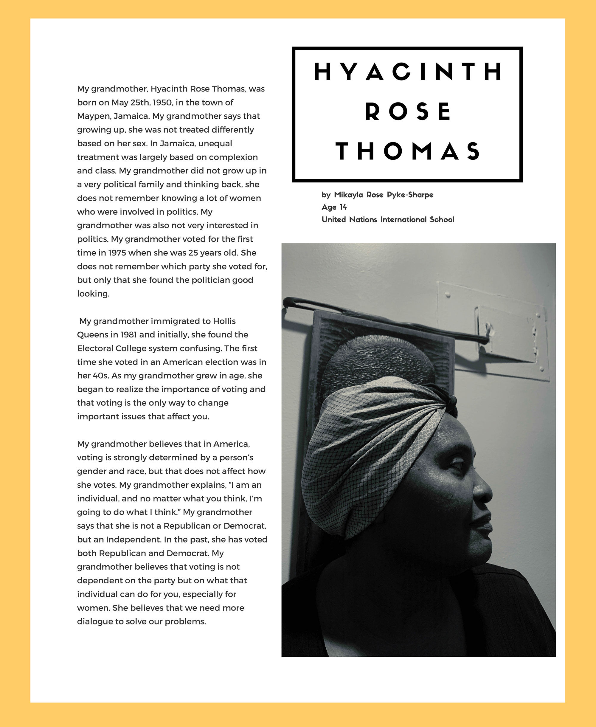 My grandmother, Hyacinth Rose Thomas, was born on May 25th, 1950, in the town of Maypen, Jamaica. My grandmother says that growing up, she was not treated differently based on her sex. In Jamaica, unequal treatment was largely based on complexion and class. My grandmother did not grow up in a very political family and thinking back, she does not remember knowing a lot of women who were involved in politics. My grandmother was also not very interested in politics. My grandmother voted for the first time in 1975 when she was 25 years old. She does not remember which party she voted for, but only that she found the politician good looking.