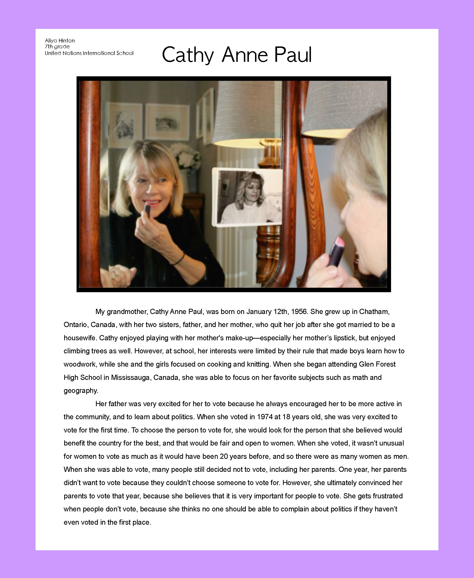 My grandmother, Cathy Anne Paul, was born on January 12th, 1956. She grew up in Chatham, Ontario, Canada, with her two sisters, father, and her mother, who quit her job after she got married to be a housewife. Cathy enjoyed playing with her mother's make-up—especially her mother’s lipstick, but enjoyed climbing trees as well. However, at school, her interests were limited by their rule that made boys learn how to woodwork, while she and the girls focused on cooking and knitting. When she began attending Glen Forest High School in Mississauga, Canada, she was able to focus on her favorite subjects such as math and geography.